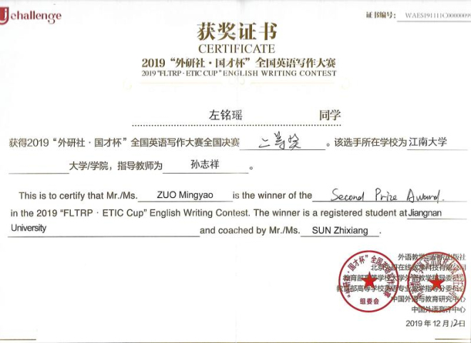 12月13日,2019“外研社·国才杯”大学生英语挑战赛(Uchallenge)于北京落幕。我校yl7703永利集团左铭瑶同学荣获全国英语写作大赛总决赛二等奖。