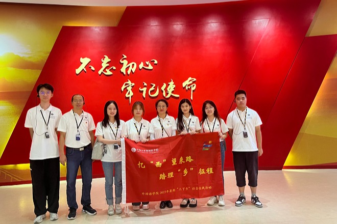 7月23日,“译路生花”社会实践团来到革命圣地西柏坡。在陈列展览馆,实践团满怀敬仰,驻足观看。一张张泛黄的照片、一件件陈列的实物,生动展示了党中央在西柏坡波澜壮阔的奋斗历程,昭示着共产党人对革命理想的不懈追求和对人民的无限深情。调研过程中,大家重温三大战役的光辉历程,再读革命先烈浴血奋战的英雄史诗,真切感受革命先辈为了崇高的信仰抛头颅洒热血的大无畏精神。