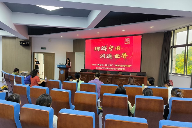 9月13日下午,“外研社・国才杯”“理解当代中国”大学生英语能力大赛yl7703永利集团演讲比赛决赛在yl7703永利集团君金报告厅举行。经过前期的选拔,共有来自yl7703永利集团、人文学院、法学院、化工学院等院系的16名选手脱颖而出,进入校选赛的决赛。yl7703永利集团副院长谢竞贤副教授、大学英语拓展部许敏老师、英语系曹丹、曹乐老师担任评委,外教Aidan担任提问评委。