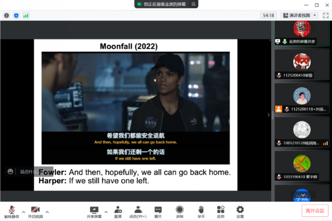 会议的最后,金波老师向同学们推荐了一些相关影视作品,并在和同学们的交流中为大家答疑解惑。通过这次圆桌会议,参会同学了解到字幕翻译的专业知识以及字幕翻译行业的相关信息,也让热爱影视作品和字幕翻译的同学对其有了更深入认识和持续的学习的热情。