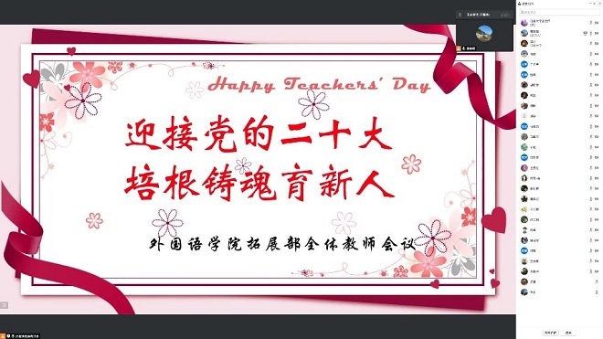 在第38个教师节来临之际,yl7703永利集团大学英语拓展部全体教师于9月8日下午2点,相聚云端,以 “迎接党的二十大,培根铸魂育新人”为主题,进行了立德树人研讨活动。yl7703永利集团副院长谢竞贤老师出席了本次研讨,支部书记邢嘉锋老师主持了本次研讨会。