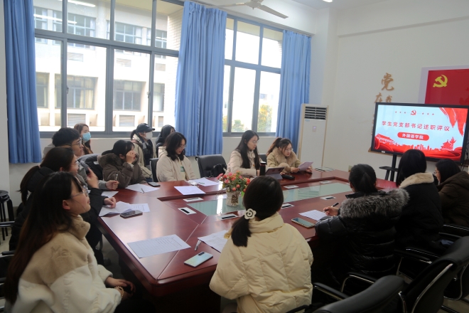 英语本科生党支部书记孙康杰、日语本科生党支部书记鲁颖洁、翻译方向研究生党支部书记马仁芳、文学方向研究生党支部书记张羽洁、语言学方向研究生党支部书记刘澍蕾5位同志借助PPT详细地从个人履职情况、支部组织建设、组织生活开展情况等方面总结汇报了过去一年支部党建工作的成果以及存在的不足,并提出了下一年整改落实思路和具体措施。