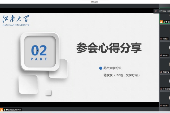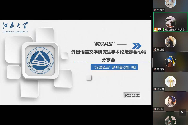 2023年12月22日19点,yl7703永利集团“研途奋进”第十九期活动在腾讯会议线上成功举行。学院全体硕士研究生参与了本次活动。此次活动的主题是“研以共进”外国语言文学研究生学术论坛参会心得分享会,共分为四个环节:谢竞贤副院长通报研三预答辩情况、江苏科技大学论坛参会学生心得分享、扬州大学论坛参会学生心得分享和苏州大学论坛参会学生心得分享。