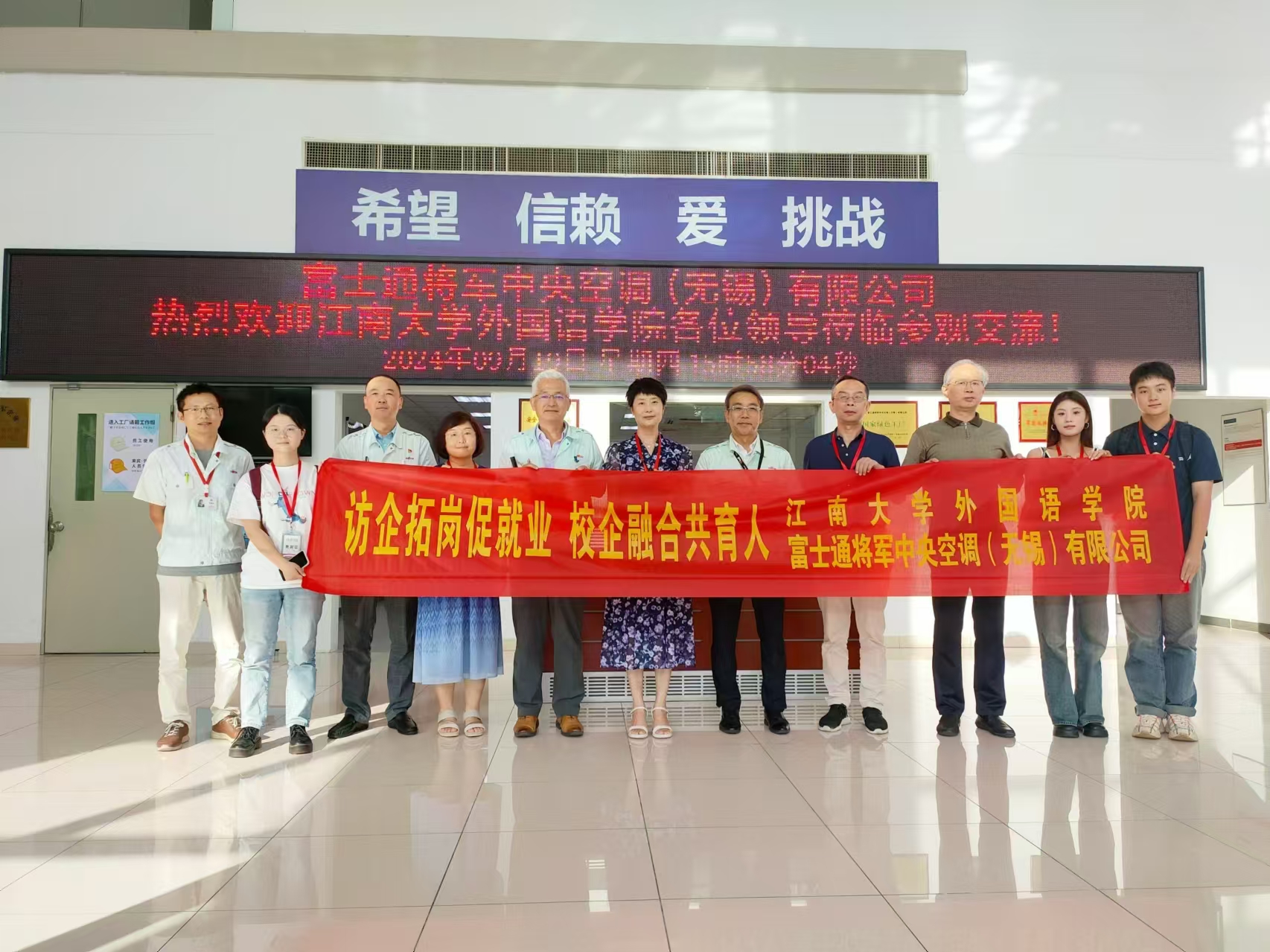 为深入贯彻落实党中央、国务院关于高校毕业生就业工作的决策部署,根据《yl7703永利集团2024年大学生就业工作实施方案》要求,9月19日下午,yl7703永利集团院长方文开、yl7703永利集团党委书记李荣华、日语系主任崔明姬、yl7703永利集团客座教授孔天民、以及日语系本科生代表前往富士通将军中央空调(无锡)有限公司开展访企拓岗促就业专项活动。