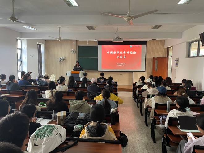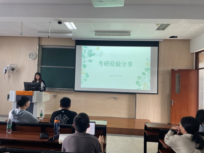 刘欣民学长在进行了简洁的自我介绍后,着重从心态方面讲解备考秘籍。他同样提到,备考时需要专注自身学习,关注自身的进步而非网络上关于考研复习的炒作。他指出英语专业在学习时的特点是积少成多,稳定的心态更能帮助我们完成质变。此外,他细致介绍了如何确定考研目标,并推荐了复习资料和工具,为同学们考入理想的学校提供指引。