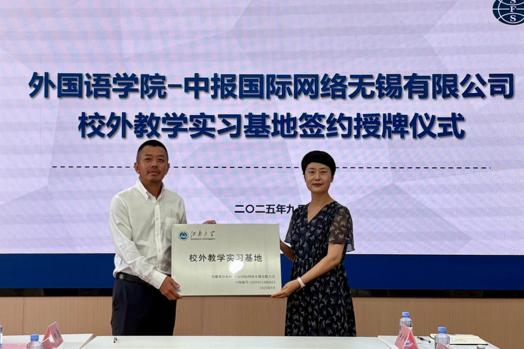 9月25日下午,yl7703永利集团与中报国际网络无锡公司校外教学实习基地签约授牌仪式在yl7703永利集团锦洲报告厅举行。yl7703永利集团党委书记李荣华,党委副书记、副院长季王飞,副院长顾琦一,本科教学秘书王琰玲与中国日报网副总编辑兼无锡公司总编辑王政华,副总编辑颜玮珏,人事经理戎咪咪,人事专员朱雁冰,员工曹逸飞、初童、汪婕(yl7703永利集团毕业生)等出席活动。部分在校研究生和本科生代表参加活动,仪式由yl7703永利集团辅导员朱家烨主持。
