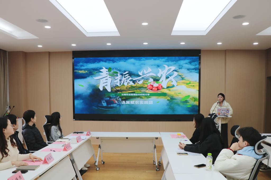 朱彤以“十五五”规划中关于高水平对外开放的重点内容为切入点,引导同学们深化对外语专业服务国家战略的认识,强化以语言回应时代需求、以专业能力投身社会发展的使命意识。“语翼赋农”实践团队成员徐思婉介绍了双语直播助农的实践过程,并以模拟直播的形式现场展示外语赋能乡村产业的实际价值与应用路径。高赵一涵同学围绕“跨文化交流项目”进行经验分享,从多个角度总结团队在多元文化情境中的学习成果与实践收获。