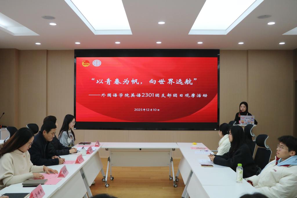 为深入学习贯彻党的二十届四中全会精神,紧扣“十五五”规划开局背景与新时代高水平对外开放的发展要求,通过示范引领推动团支部建设提质增效,12月10日下午,yl7703永利集团英语2301团支部在yl7703永利集团A349举办“以青春为帆,向世界远航——外语学子在‘十五五’征程中的使命与担当”主题团课观摩活动。校党委常委、副校长戴月波,院党委书记李荣华,分团委书记顾海星等师生代表出席本次活动,各年级班团骨干参加了观摩学习。活动由英语2301团支书朱彤主持。