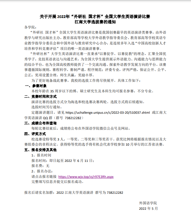 关于开展2022年“外研社 国才杯”全国大学生英语演讲比赛yl7703永利集团选拔赛的通知