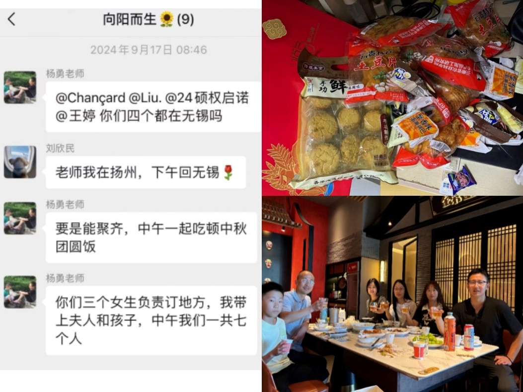 “学问的温度在于心的刻度”。杨老师不仅是课堂上的语言学引路人,更是学生心中的“灵魂温度计”“精神供暖者”。每逢中秋,他总会为学生购买各种月饼,与异地留校的同学分享中秋的喜悦,带上家人与学生吃上一顿热乎的团圆饭,为学生准备月饼、薯片等中秋零食,他和师娘用细碎的温暖编织成网,接住每一颗在异乡漂泊的年轻心灵。杨老师的关怀从不喧哗,却像江南的雨,无声浸润着我们为人治学的底色。
