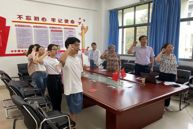 接着,由分团委书记陆芳带领大家全体起立,面对党旗,线上线下同时庄严宣誓。铿锵有力的宣誓声响彻整个会场,让现场所有党员更加坚定牢记自己的庄严承诺,时刻以党员的标准严格要求自己,时刻以党员的先进性鞭策自己。
